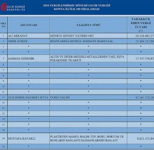 İkinci sırada menkul sermaye iradı faaliyetinden 23 milyon 404 bin 237 TL vergi ödeyen Ömer Atiker, üçüncü sırada ise altın ve değerli metaller sektöründe faaliyet gösteren Şammas Özdemir (17 milyon 337 bin 256 TL) yer aldı.