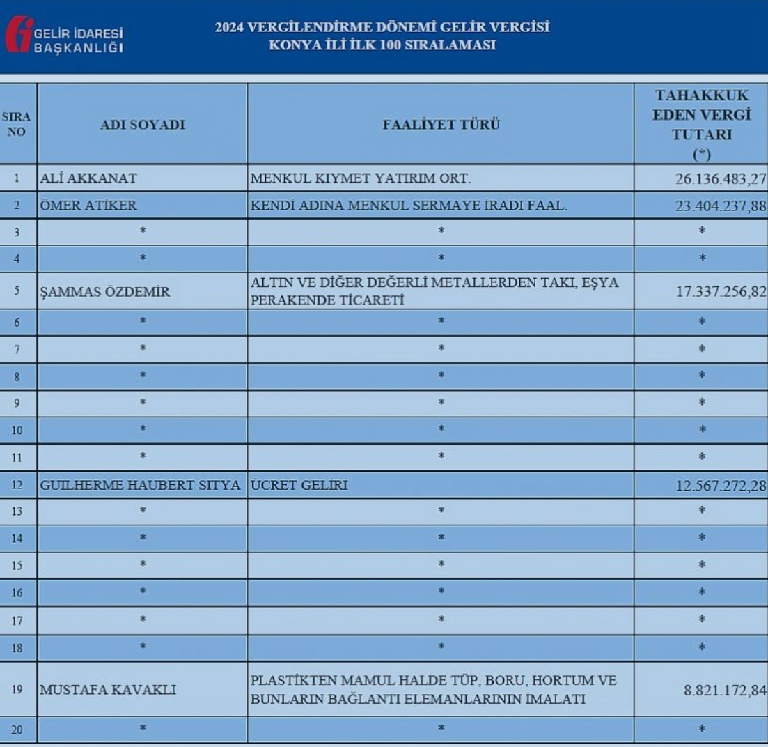 Konya’da 2024 yılı için en fazla gelir vergisi beyan eden isim Ali Akkanat oldu. Menkul kıymet yatırım ortaklığı faaliyetinden 26 milyon 136 bin 483 TL vergi beyan eden Akkanat, listenin birinci sırasında yer aldı.